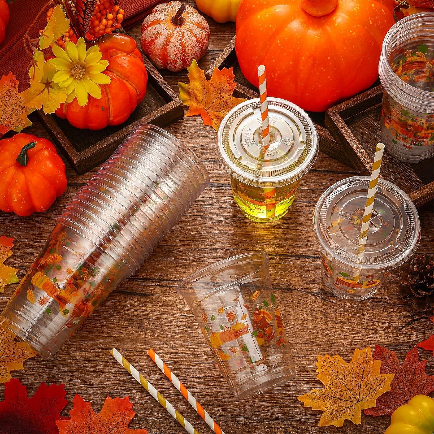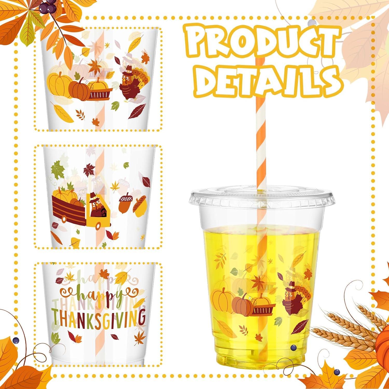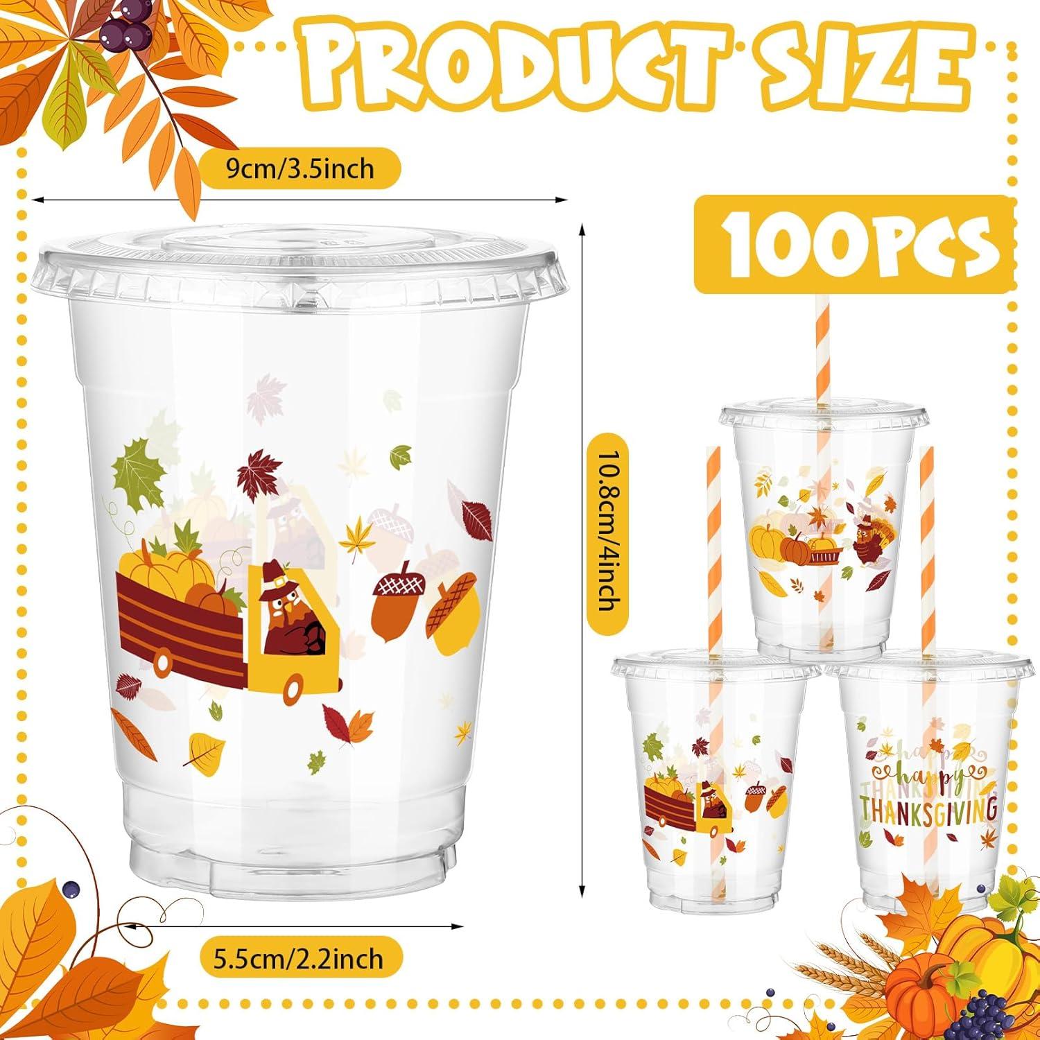 Sliner 300 Pcs 100 Set Thanksgiving Disposable Cups 12 oz Turkey Plastic Cups Give Thanks Clear Plastic Tumblers for Coffee Juice Ice Juice Beverage Thanksgiving Party Supplies