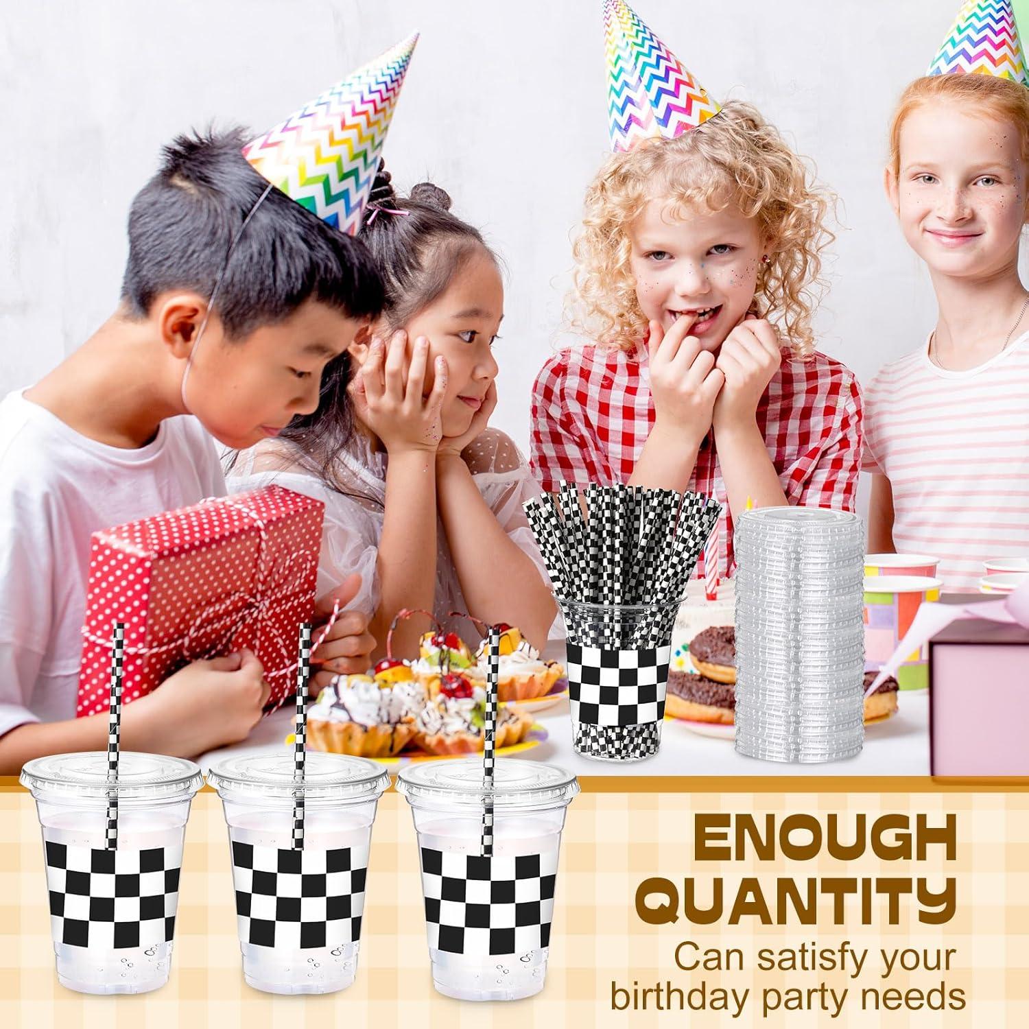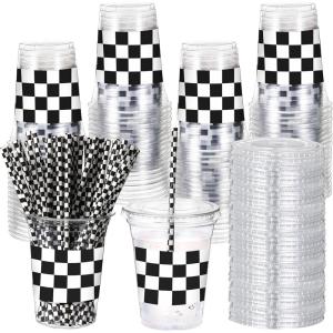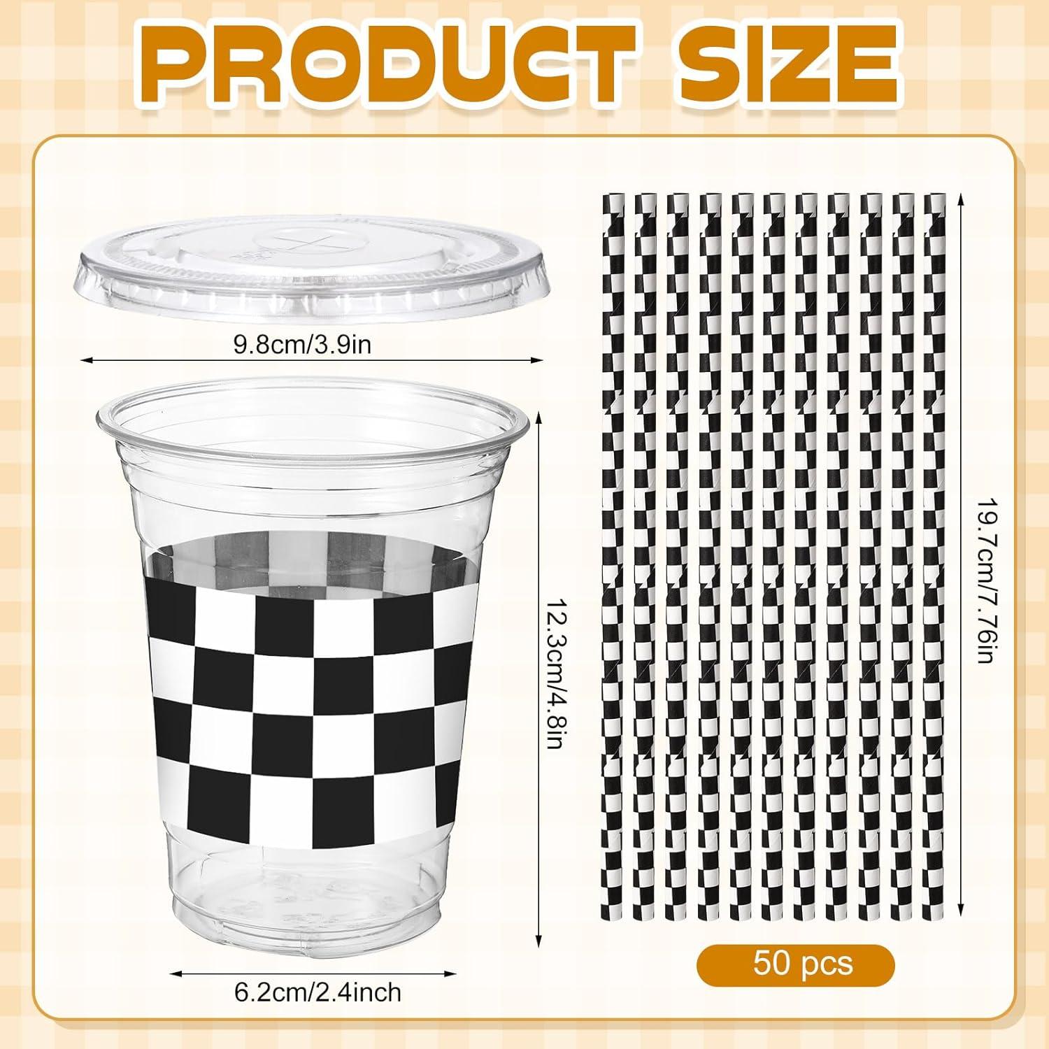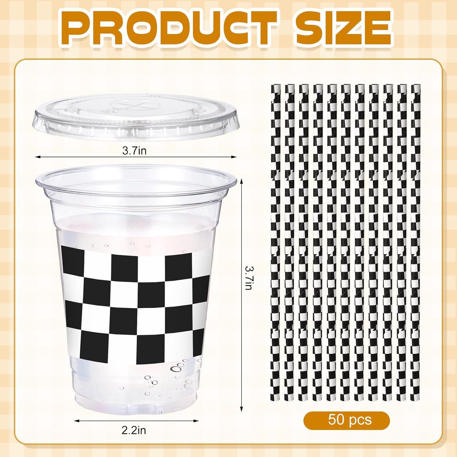 Sliner 50 Sets Plastic Cups Disposable with Lids and Paper Straws 16 oz Clear Drinking Cups for Xmas Checkered Flag Cow Print Themed Holiday Birthday Party(Checkered Racing Style)(Checkered Racing Style)
