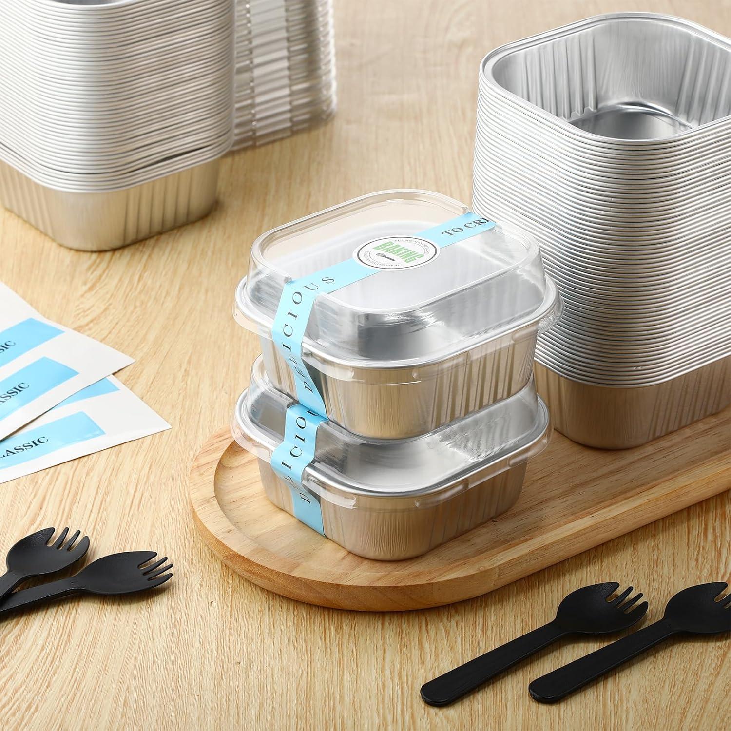 Convenient Package: this set includes 100 pieces of aluminum pans with lids, 100 pieces of disposable sporks, and 100 pieces of stickers, providing various things need for your baking needs in one package