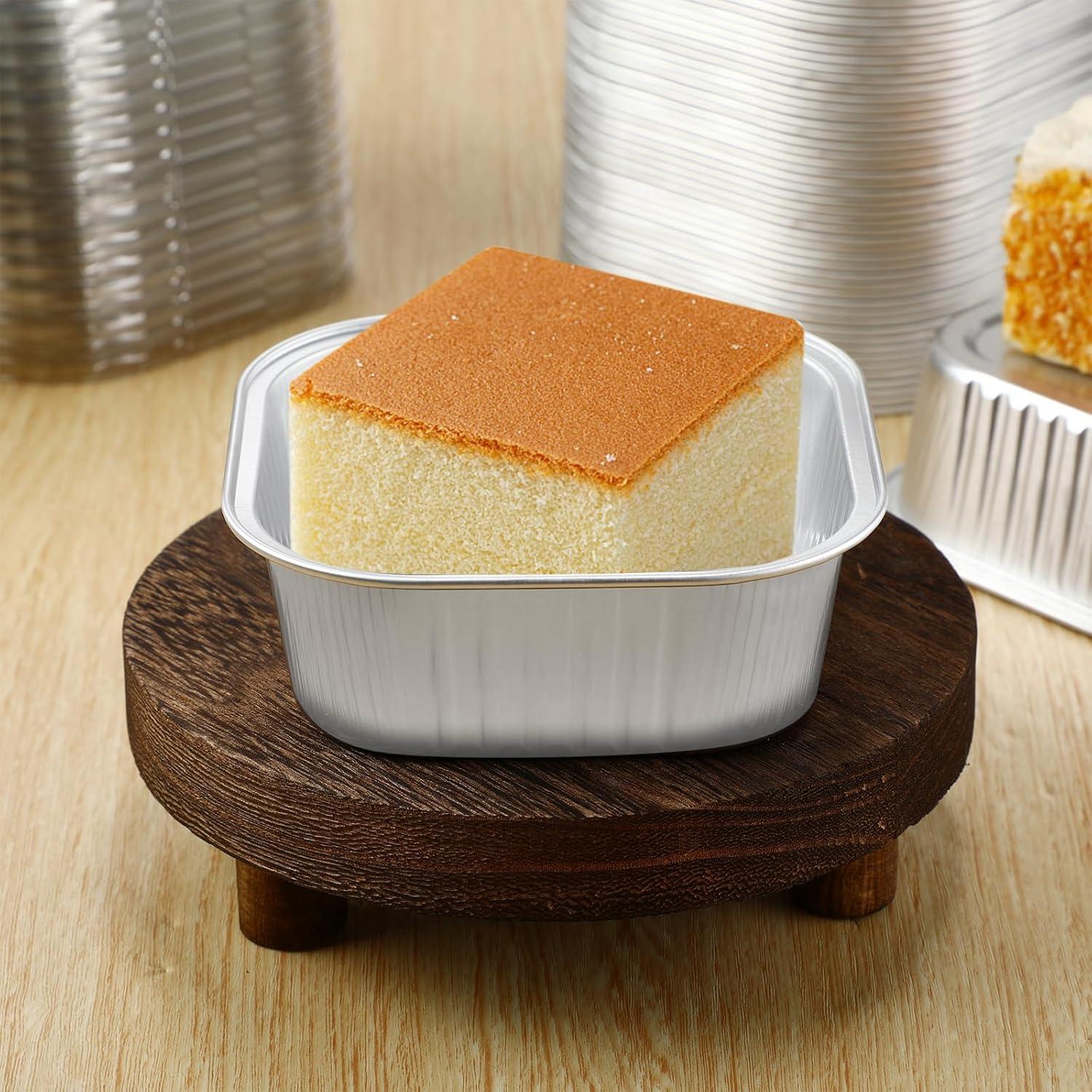 Sliner 100 Pcs 10 oz Mini Cake Pans with Lids Aluminum Foil Disposable Ramekins Mini Cake Cups with Spork Sticker Square Cupcake Cups Baking Tins for Kitchen Party Wedding Birthday(Gold Silver)(Silver)
