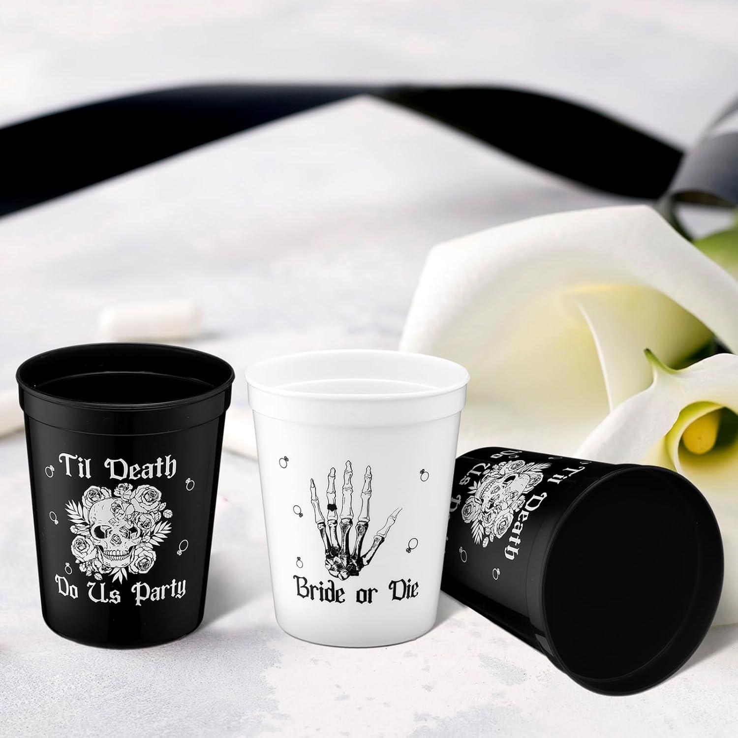 Exquisite Design: these bride or die 16 oz plastic cups are designed with skeletons and flowers, in white and black colors, stylish and cool, printed with 'bride or die' and 'til death do us party', eye catching and delicate additions to your bachelorette, leaving you and your guests a memorable experience