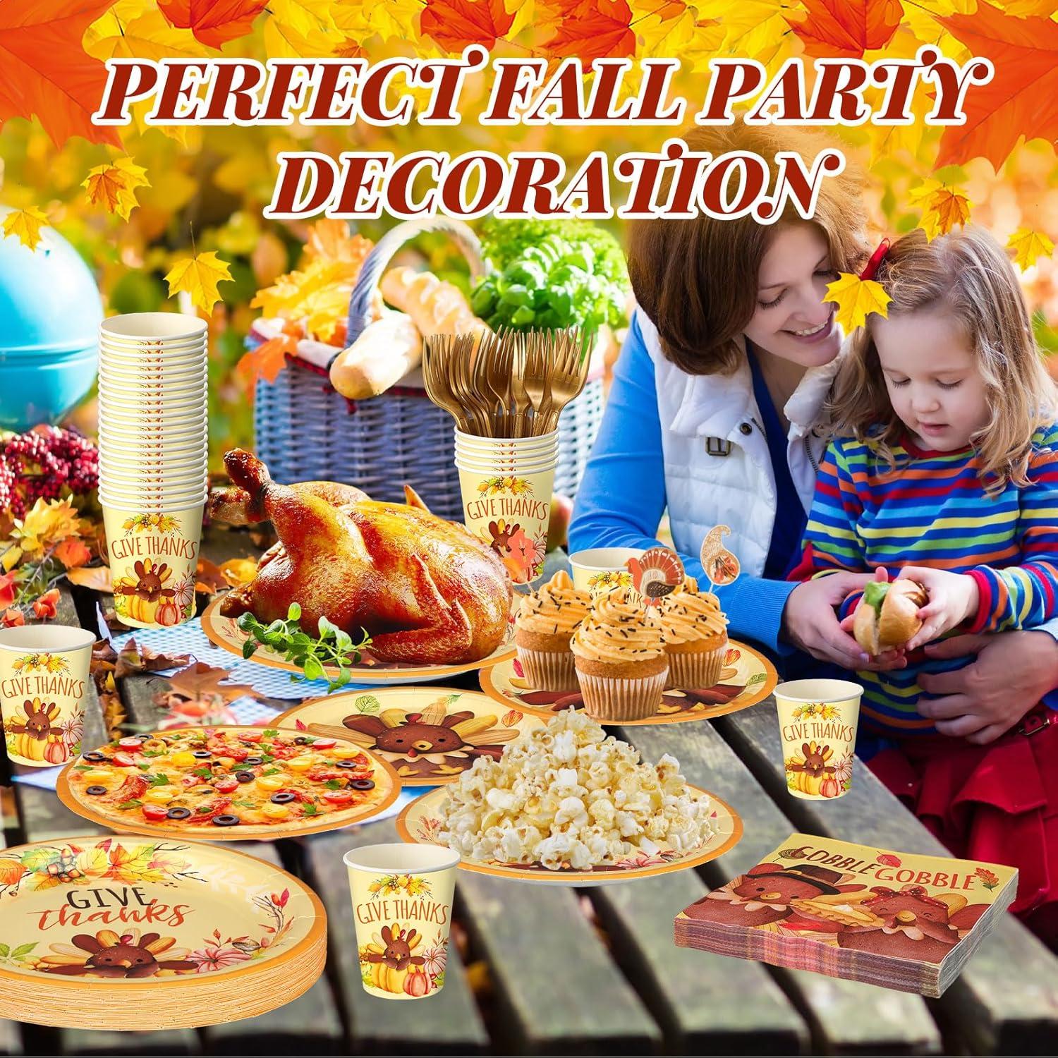 Sliner 180 Pcs Fall Party Plates and Napkins, Fall Party Supplies Include Paper Plates Napkins Cups Fork Disposable Tableware Set for Autumn Thanksgiving Decorations, Serves 30(Blue Car Pumpkin)(Cute Turkey)