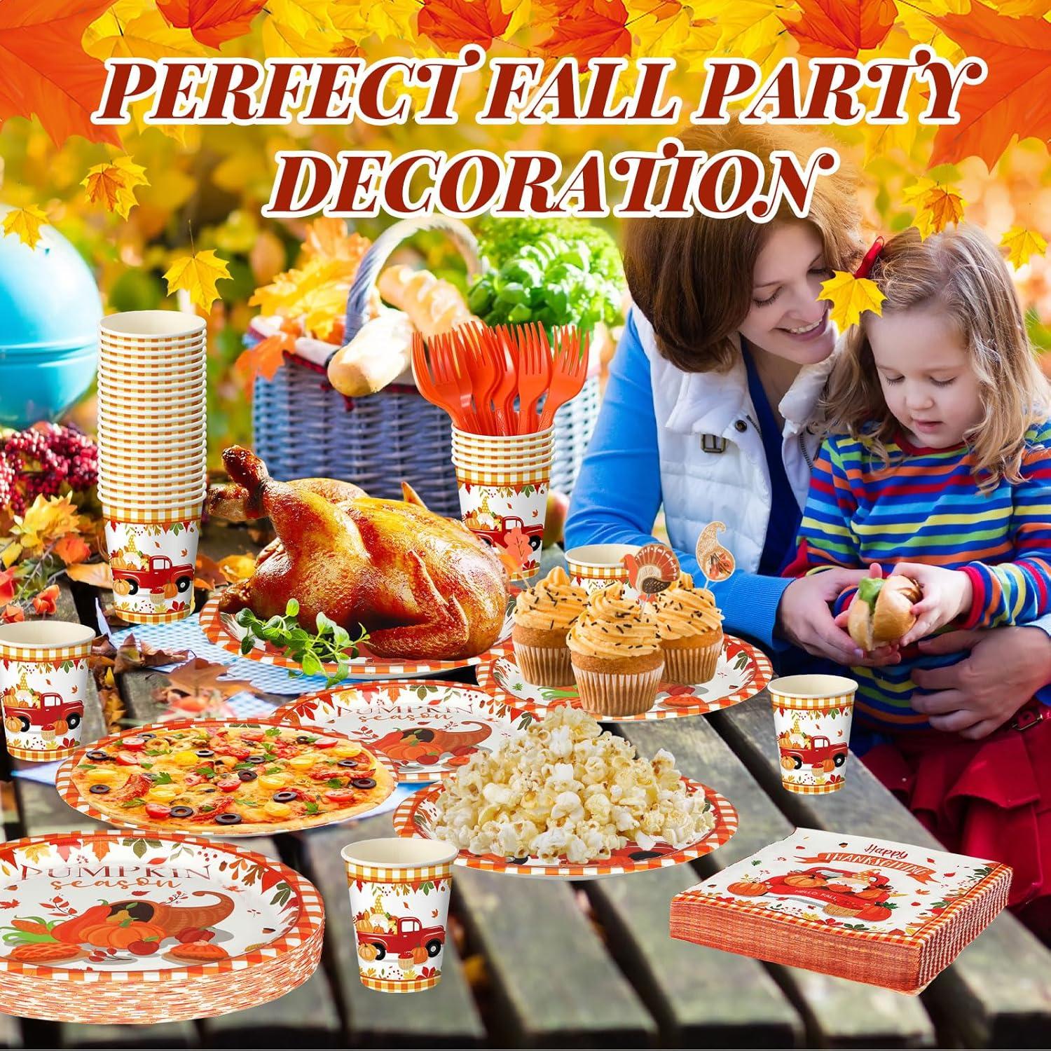 Sliner 180 Pcs Fall Party Plates and Napkins, Fall Party Supplies Include Paper Plates Napkins Cups Fork Disposable Tableware Set for Autumn Thanksgiving Decorations, Serves 30(Blue Car Pumpkin)(Red Car Pumpkin)