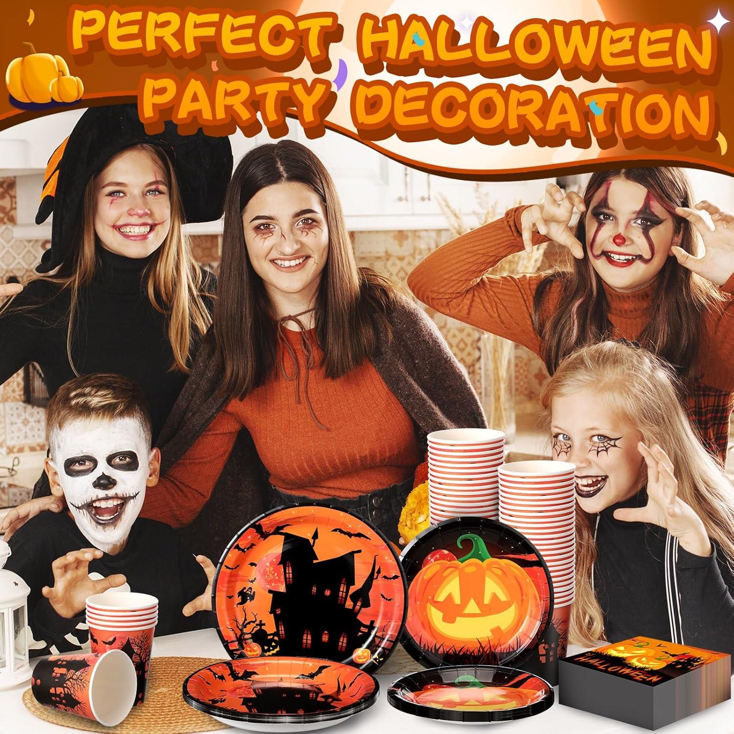 Sliner 180 Pcs Halloween Party Supplies Plates Napkins Cups Serve 30 Halloween Disposable Paper Dinner Dessert Plates Spooky Napkins Cocktail Beverage Cups Plastic Fork Set (Multicolor,Cute Style)(Orange)