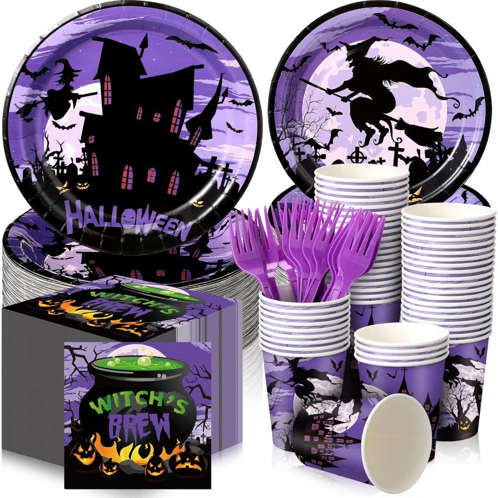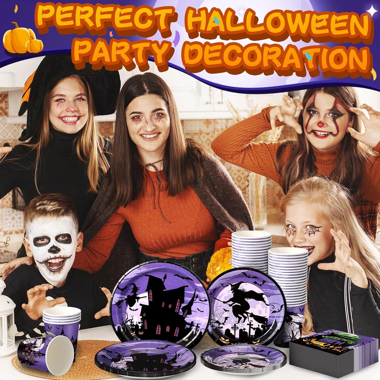 Sliner 180 Pcs Halloween Party Supplies Plates Napkins Cups Serve 30 Halloween Disposable Paper Dinner Dessert Plates Spooky Napkins Cocktail Beverage Cups Plastic Fork Set (Multicolor,Cute Style)(Purple)