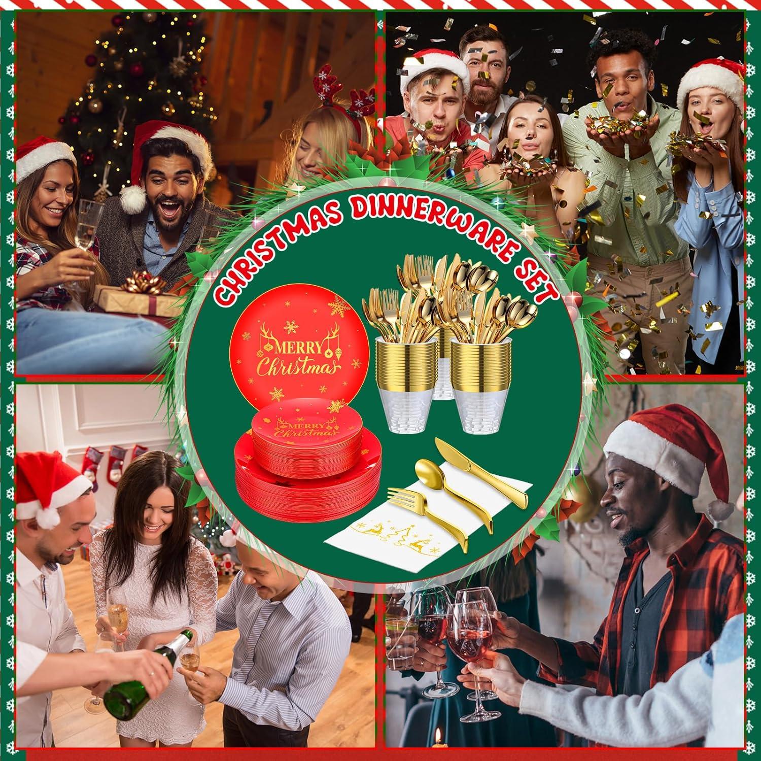 Vibrant Festive Design: the plastic plate disposable comes in a vibrant red base with gold edges, and the cups in a transparent design with bright edges, radiating festive charm; The tableware items and napkins have unique Christmas themed designs imprinted, creating a captivating dining experience and a stimulating Christmas atmosphere