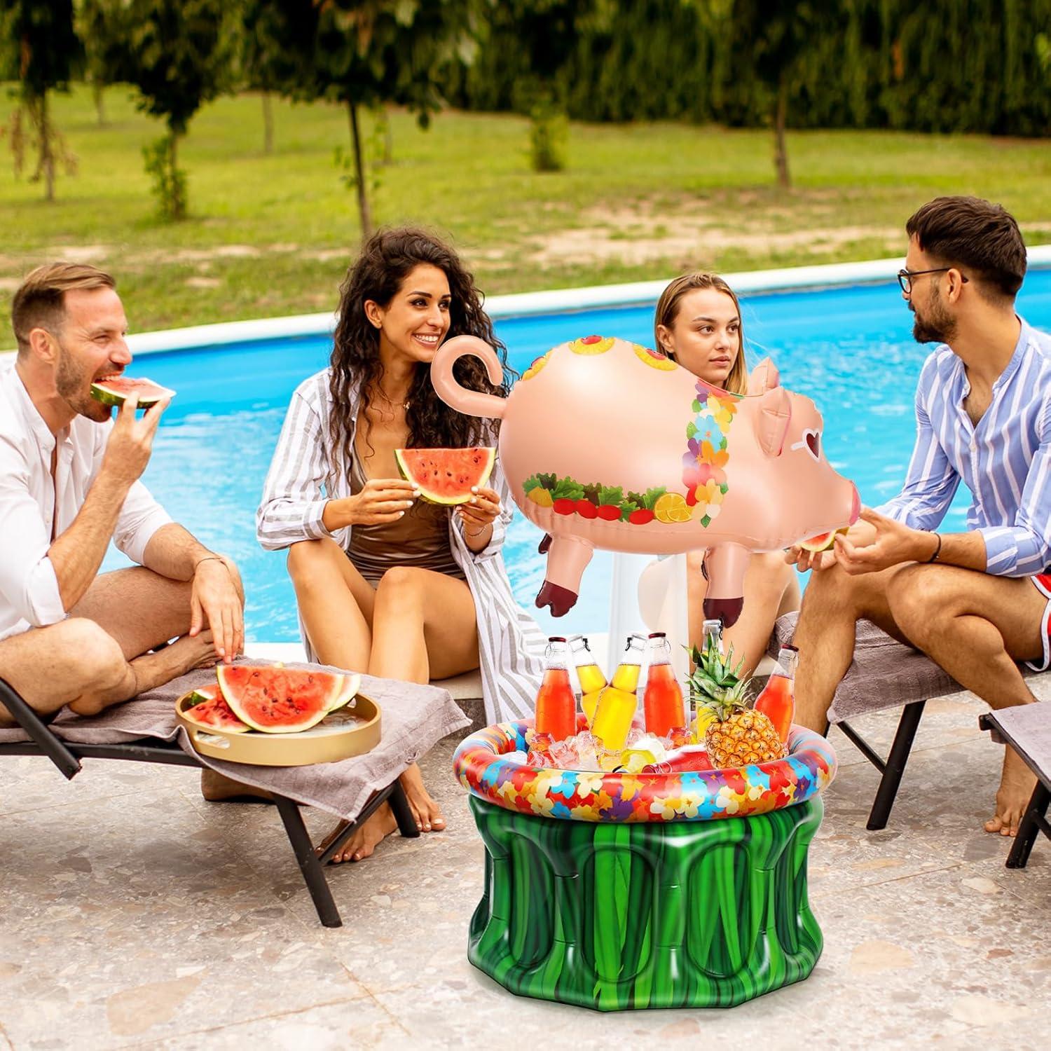 Sturdy and Reusable: luau party inflatable cooler is made of quality PVC material, durable and can be used multiple times. Holding plenty of ice to keep drinks, cans, food and fruit cold during outdoor gatherings, our Luau Pig inflatable cooler keeps your family and guests cool on hot days