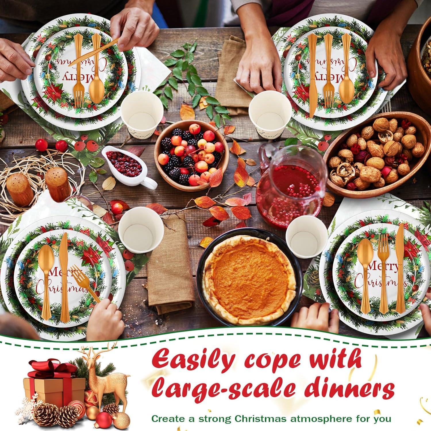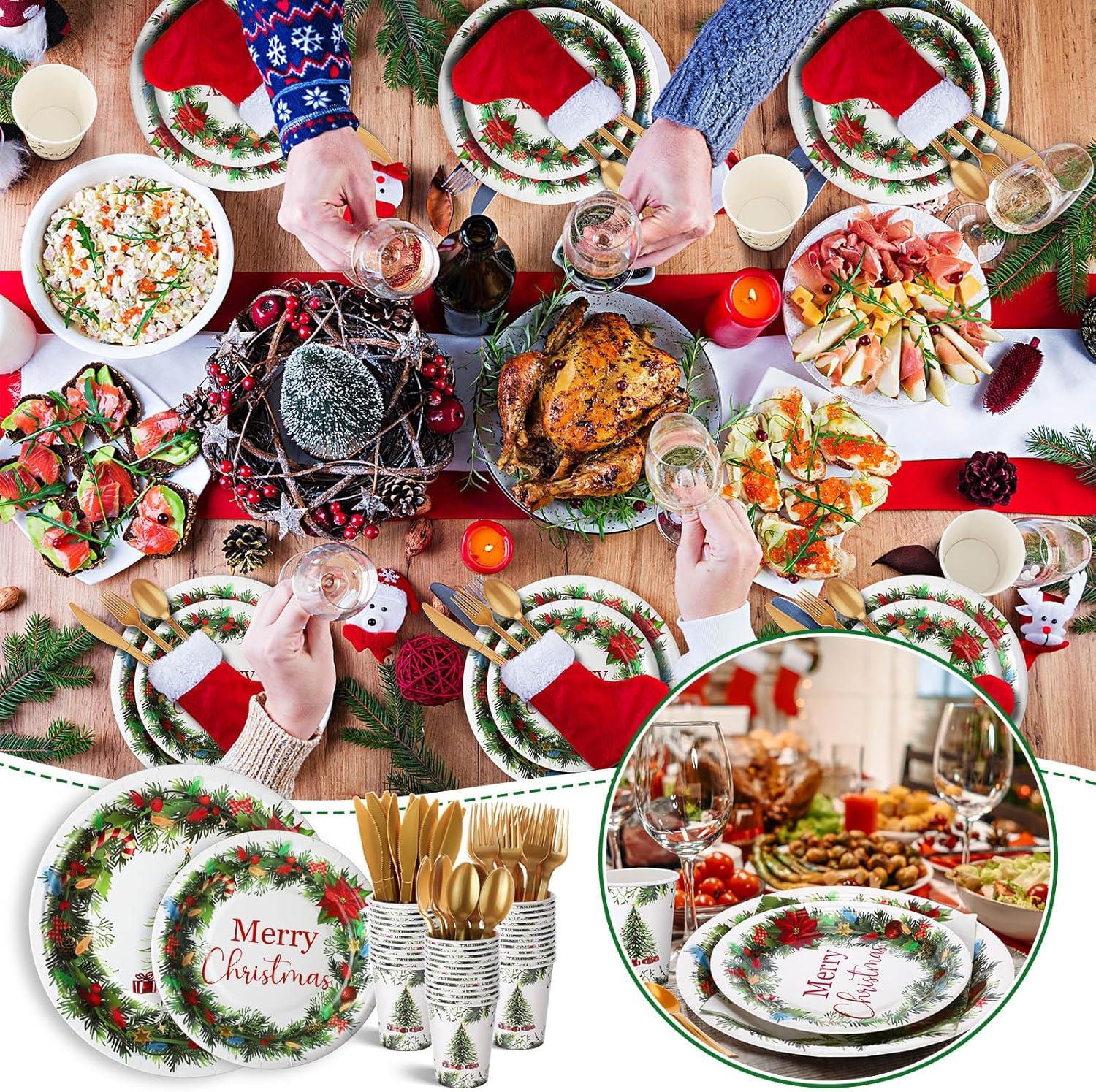 Sliner 350 Pcs Christmas Paper Plates and Napkins Set Disposable Xmas Tableware Dinnerware Party Supplies Includes 100 Paper Plates 50 Cups 50 Napkins 50 Sets Knives Forks and Spoons for 50 guests(Cheerful Colors)