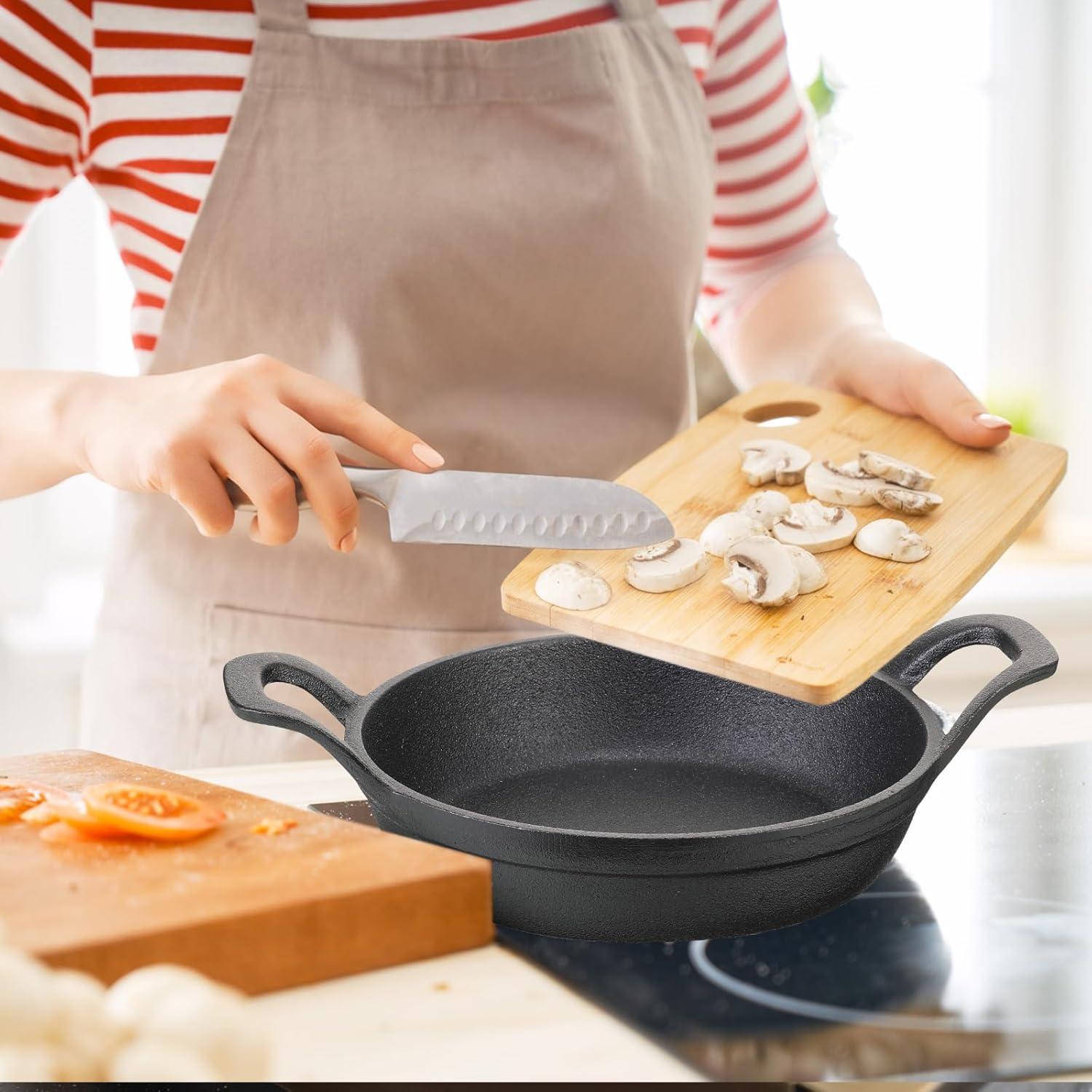 Convenient to Use: the cast iron serving skillet is pre seasoned with vegetable oil, it allows you to jump right into your cooking adventure, ensure your hand is dry and gently rub in a fresh coat of vegetable oil, then make delicious cooking as you want