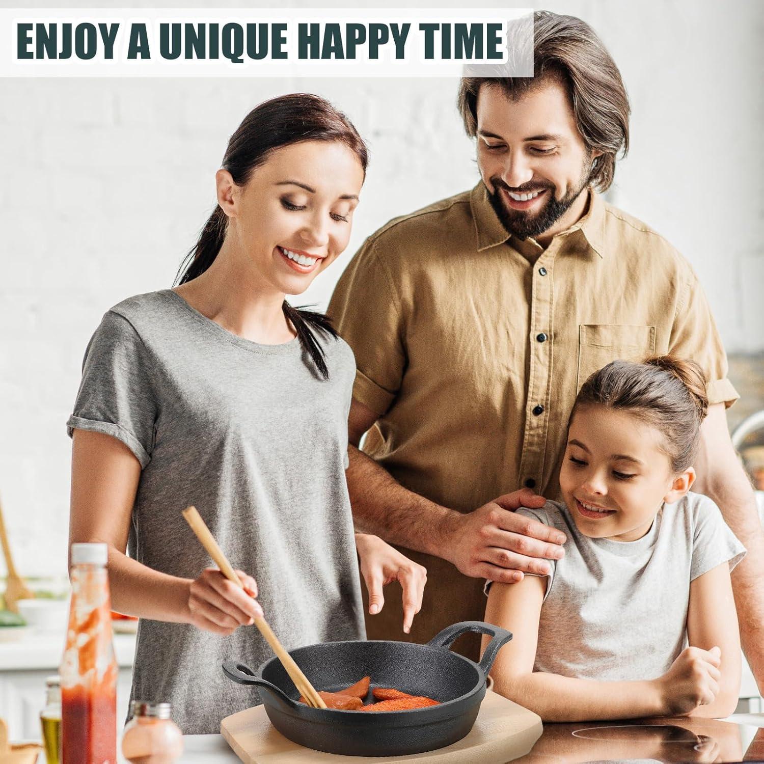 Sliner 4 Sets Mini Cast Iron Skillet Small Cast Iron Plates Skillet with Wooden Base Small Round Pan Fajita Plate Pot for Baking Cooking(6.3 Inches)(6.3 Inches)