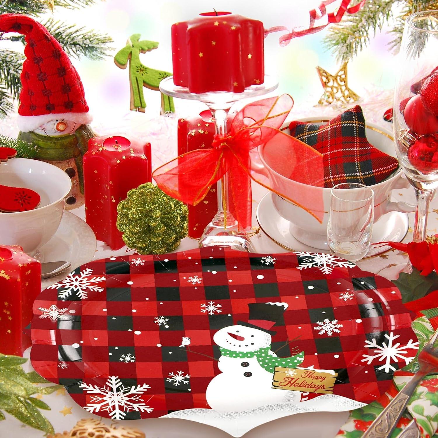 Aesthetic Design: showcasing a visually pleasing buffalo plaid layout, enhanced with snowman and snowflake designs, these Christmas plates disposable add a festive feel to your home or party decorations; The vibrant Christmas colors complement many table settings, delivering an elegant but radiant ambiance merging within your dining room's charm