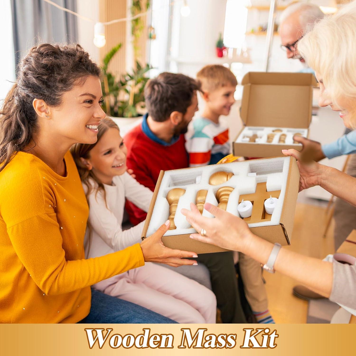 Comprehensive Package: this 16 piece wood play mass kit is complete with a variety of items, including 1 altar cross, 1 chalice, 1 pyx, 2 cruets, 2 candles, 2 candle holders, 1 paten and 6 communion wafers, enabling kids to learn a lot in a lively way