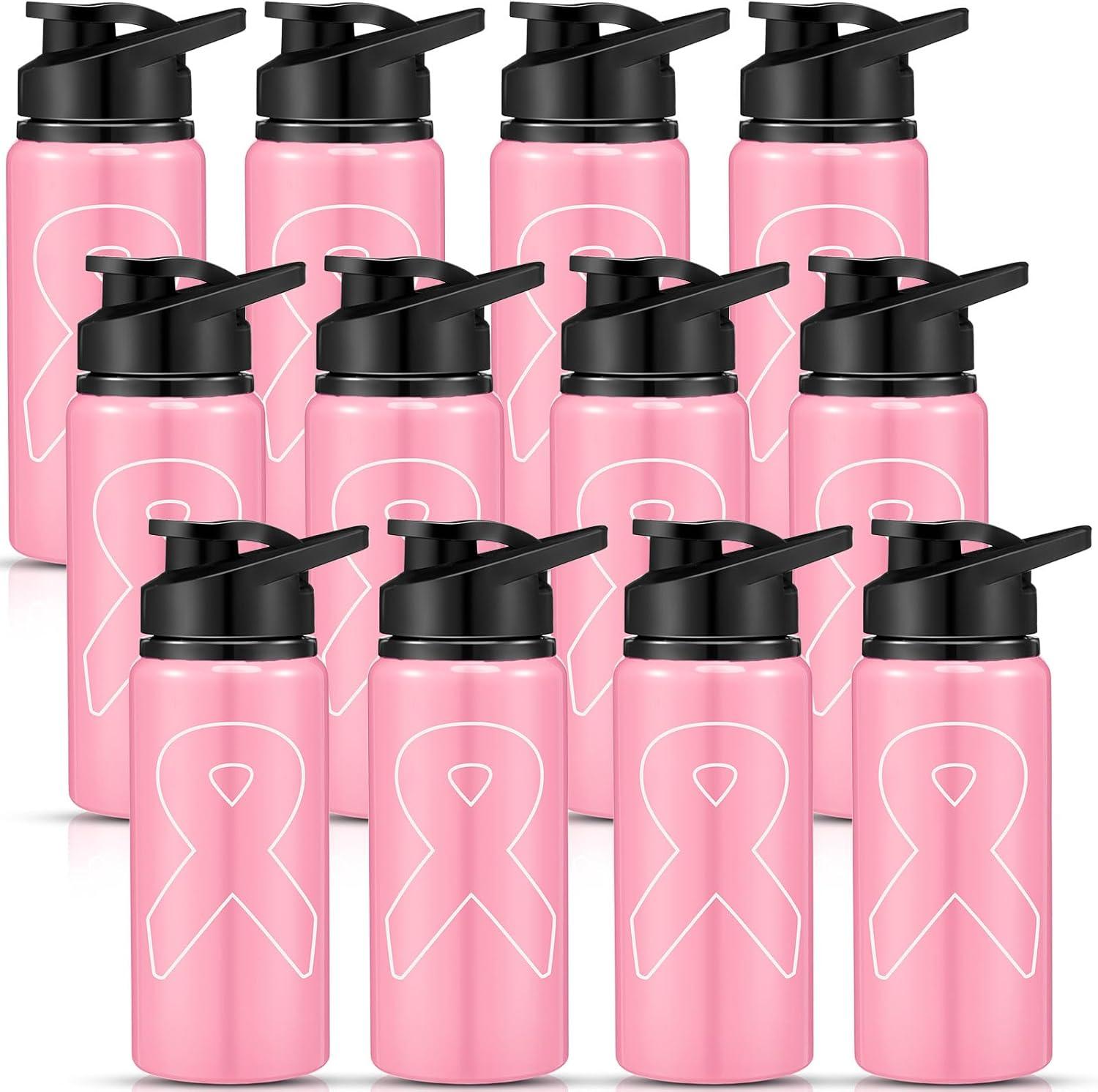 Tticai 12 Pieces Breast Cancer Awareness Aluminum Water Bottle Pink Ribbon Bike Water Bottle Reusable Bottles Leak Proof Lightweight Portable Bottles for Marathon Running(20 oz)